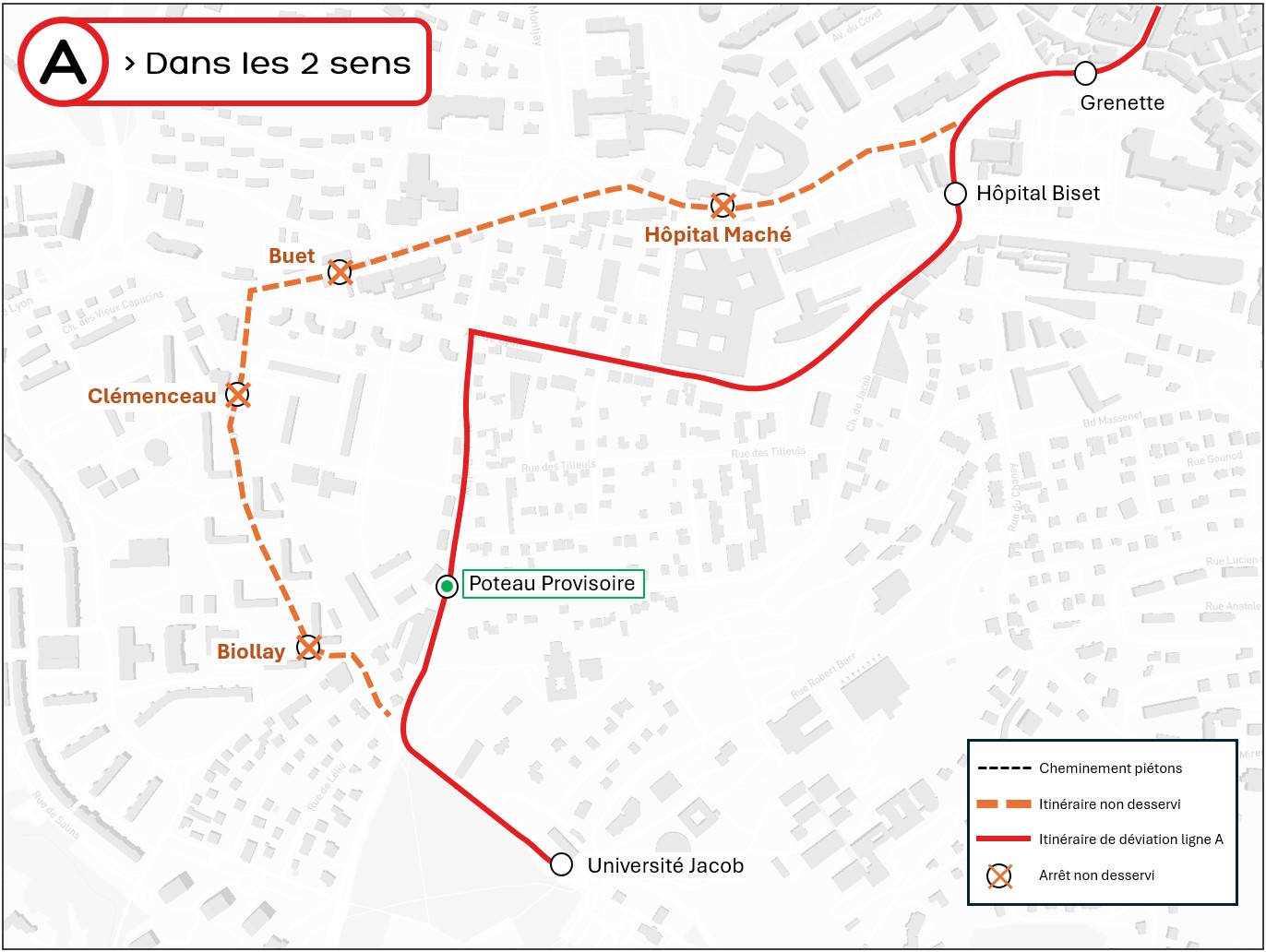 L’arrêt « Caf » est neutralisé et reporté à l’arrêt « Piscine du Stade ». Les arrêts « Sécurité Sociale », « Covet », « Grenette » et « Halles » sont neutralisés et reportés à l’arrêt « Gare ».
