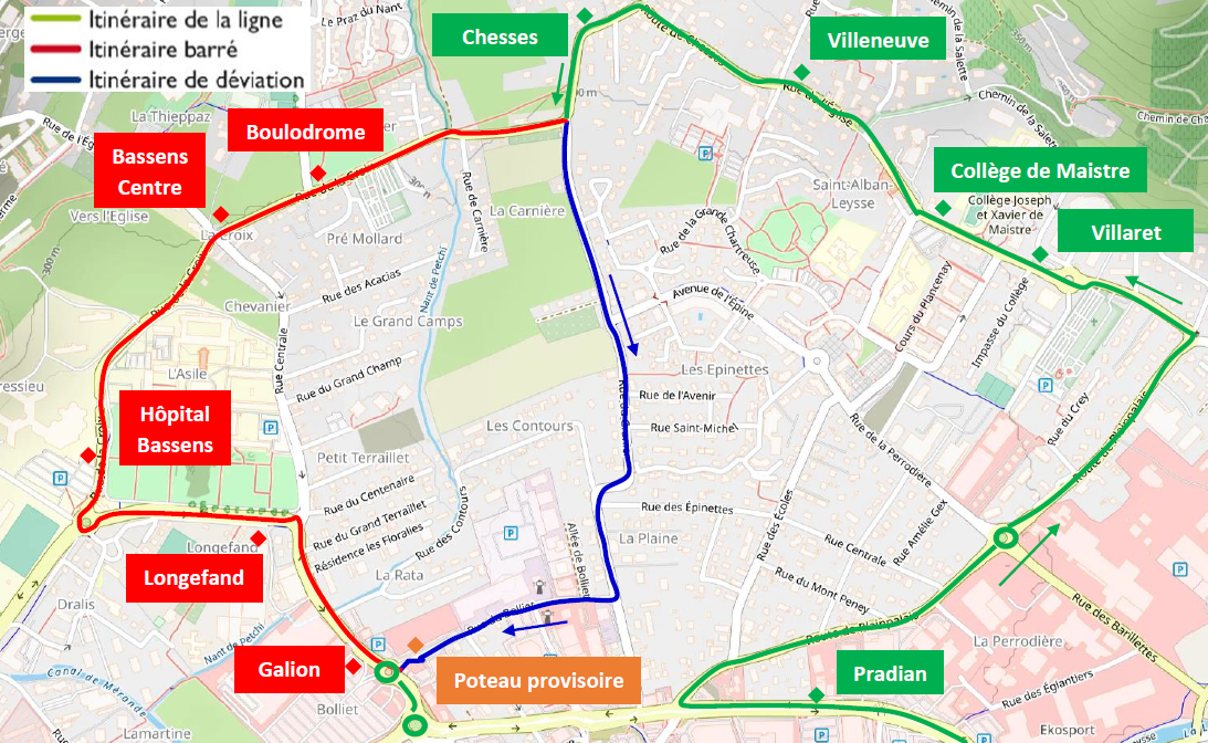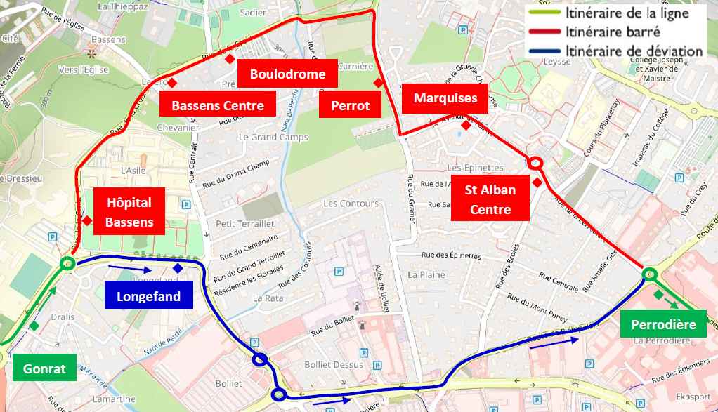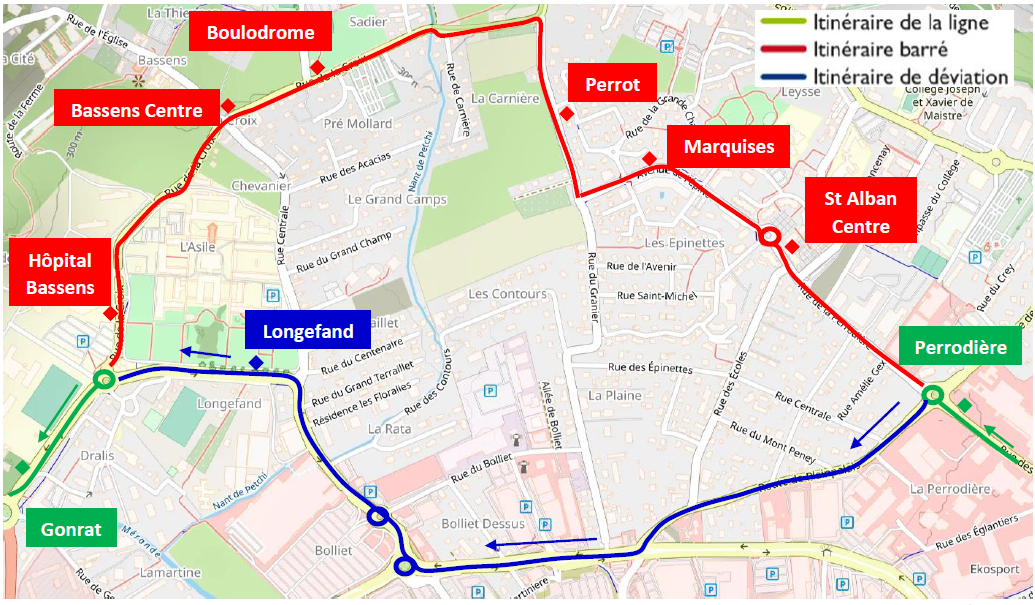 Les arrêts « Hôpital Bassens », « Bassens Centre » et « Boulodrome » sont neutralisés et reportés à l’arrêt « Chesses ». Les arrêts « Longefand » et « Galion » sont neutralisés et reportés au Poteau Provisoire situé rue du Bolliet.